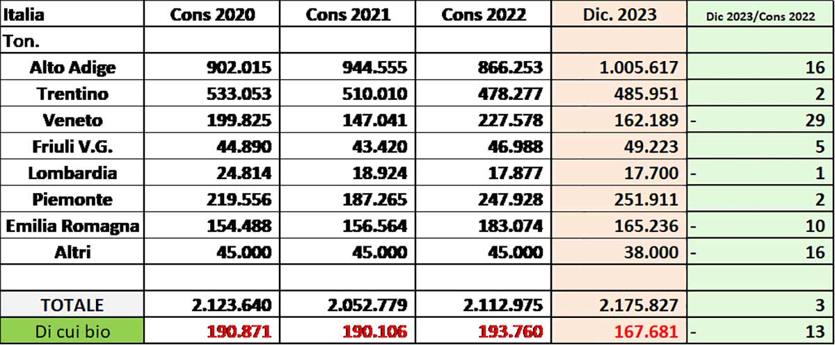 A livello regionale, l’Alto Adige si porta a 1.005.617 ton., in incremento del 16% rispetto al 2022, mentre il Trentino rimane stabile a 485.951 tons., aumentando solo leggermente rispetto alla produzione dell’anno precedente. In Piemonte la situazione è positiva con una produzione stabile del 2% sul 2022 e, pur colpite da alcune grandinate, le mele piemontesi ben protette da reti antigrandine hanno avuto danni contenuti. Il Veneto risulta la regione più interessata da diffusi danni da gelate e da grandine, che hanno portato a contrazione della produzione del 29% sul 2022 ed una disponibilità di mele da mercato fresco che arriva solo al 43% del totale. Anche in Emilia-Romagna si segnano danni da grandine, oltre a danni da vento con una produzione in riduzione del -10%. I danni derivati dall’alluvione dello scorso maggio per il settore melicolo si sono confermati meno impattanti rispetto alle prime impressioni. Friuli e in Lombardia sono stabili con un consuntivo rispettivamente del 5% in aumento ed 1% in calo sul 2022.