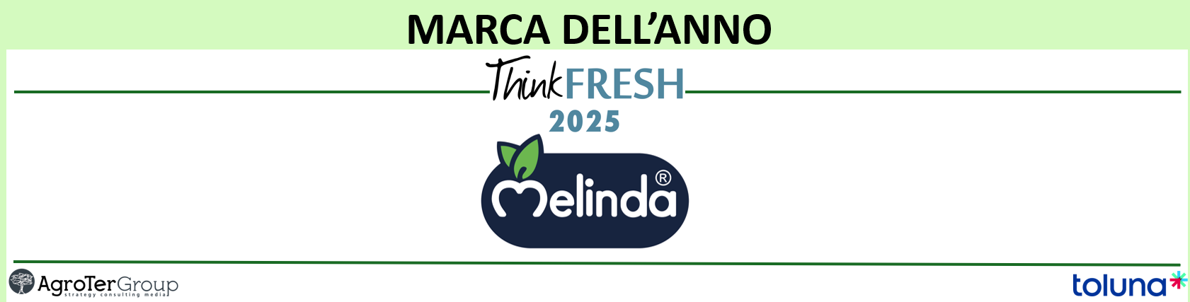 Melinda si aggiudica il premio "Marca dell'Anno" durante la decima edizione di Think Fresh. La marca è la vincitore della sesta edizione del contest, dedicato al brand che, nell'ultimo anno, ha fatto registrare il maggior incremento della notorietà top of mind e spontanea tra i consumatori italiani, sulla base delle analisi del Monitor Ortofrutta di Agroter in collaborazione con Toluna.