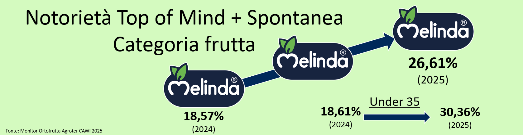 Il brand è passato dal 18,57% di notorietà top of mind e spontanea della rilevazione 2024 al 26,61% del 2025 nella categoria frutta, con un incremento di oltre 7 punti. “Ciò che è peculliare, in un comparto maturo come le mele”, ha sottolineato Roberto Della Casa, "è l'aumento della notorietà, di oltre 12 punti, nel segmento degli under35 che nel 2025 supera il 30%. Crescere nella fascia di popolazione più giovane è, infatti, la vera sfida per tutti, poiché è quello più complesso nel quale registrare incrementi. Come leggete questa performance? Vi aspettavate di ricevere il riconoscimento?"