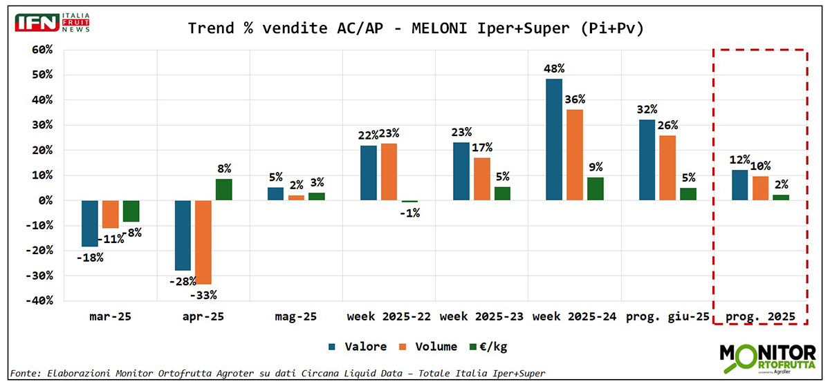 Nel dettaglio, il melone – che ha già chiuso una campagna chiave come quella siciliana – ha mostrato una partenza timida tra marzo e aprile, seguita da una crescita graduale a maggio e da un vero balzo a giugno: +26% a volume, +32% a valore e prezzi in salita del 5%. Complessivamente, da inizio campagna, i volumi e i ricavi sono aumentati tra il 10% e il 12%, con quotazioni in crescita di circa due punti percentuali.