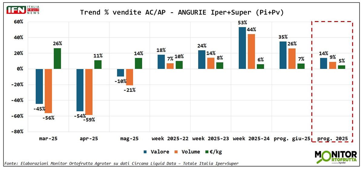 Con la chiusura di giugno, il Monitor Ortofrutta di Agroter può tracciare un primo bilancio della campagna angurie e meloni nel canale Iper+Super, aggiornato alla settimana 24. I dati raccontano una partenza decisamente positiva, con aumenti a doppia cifra su tutti i principali indicatori: volumi, prezzi e valore delle vendite.