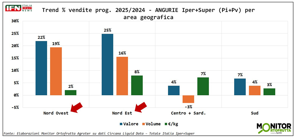 A guidare il trend positivo dell’anguria è il Nord Est, spinto anche dalle temperature favorevoli, seguito da un Nord Ovest in crescita. Buoni segnali anche dal Sud, mentre il Centro Italia mostra un leggero calo dei volumi.