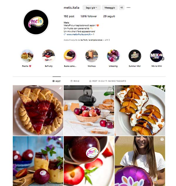 Per quanto attiene il marketing e la comunicazione, negli ultimi 12 mesi Metis® ha lavorato nel solco delle interessanti esperienze degli anni precedenti, al fine di consolidare gli ottimi risultati raggiunti per esempio sui Social, Instagram in primis. Allo stesso tempo, il brand ha incontrato il consumatore finale con l’obiettivo di far provare direttamente il prodotto. Ciò è avvenuto fuori dal punto di vendita attraverso la partecipazione al tour estivo BE FRUITY! ® , che ha fatto tappa al Rimini Wellness e nelle spiagge italiane, coordinato e gestito da SGMARKETING, in occasione del quale Metis® ha raggiunto in il suo target preferenziale, giovani e famiglie in primis, non solo proponendosi come frutto tal quale, ma anche come protagonista di cocktail analcolici.