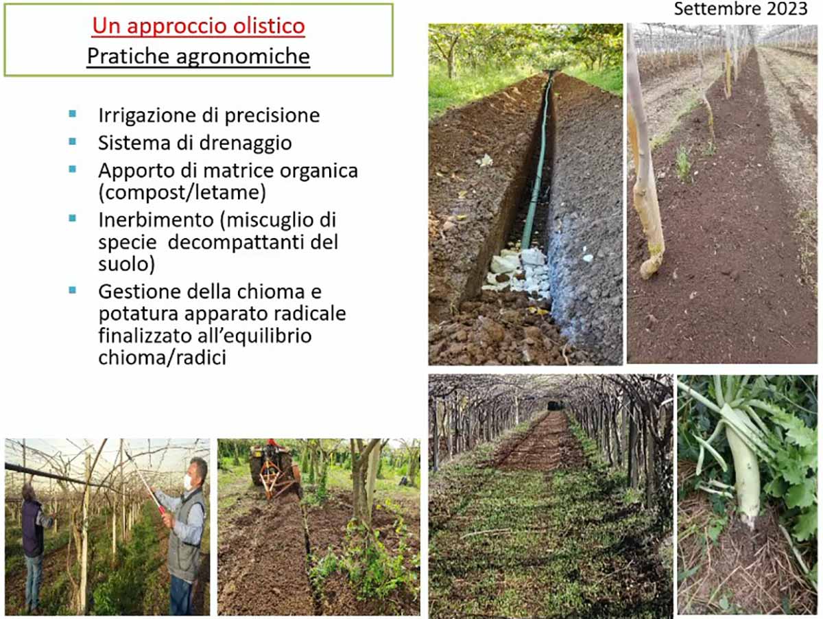 La complessità di questa fisiopatia è causata da una moltitudine di fattori che concorrono al suo sviluppo, tant’è che viene definita una sindrome multifattoriale, come ha ricordato Luca Nari della Fondazione Agrion: “Innanzitutto, il clima sempre più estremo, a partire dai picchi termici estivi e dagli intensi eventi pluviometrici sempre più frequenti, ha accelerato le problematiche già in atto a livello di suolo, pianta e microrganismi patogeni, senza dimenticare il ruolo determinato dall’adozione di alcune pratiche agronomiche scorrette, in primis gli eccessi irrigui”.