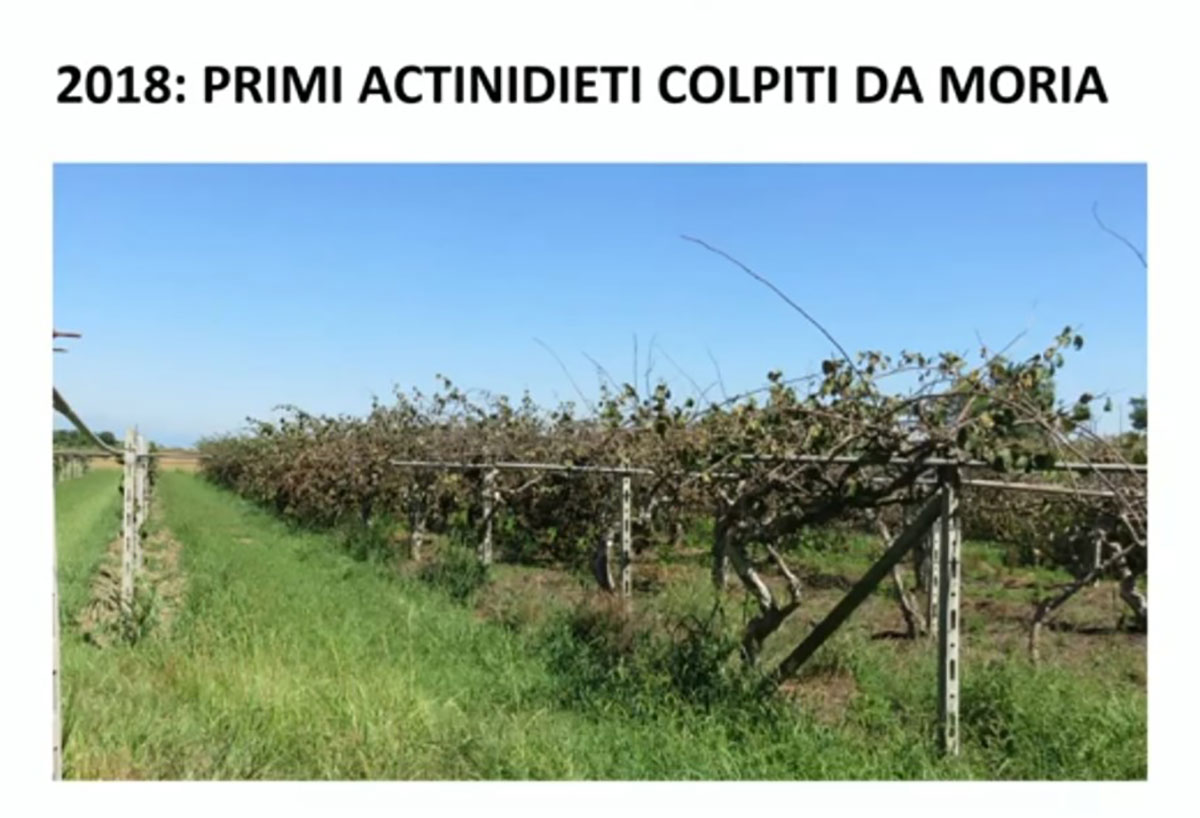 In ogni caso, per una corretta comprensione della fisiopatia è fondamentale focalizzarsi fin da subito sulle radici, come ha spiegato il professore Bartolomeo Dichio, docente dell’Università della Basilicata: “La pianta d’actinidia è per definizione poco resiliente e mal si adatta alle condizioni avverse, in particolare, carenze ed eccessi idrici. Questi due fenomeni presentano gli stessi sintomi e possono comparire entrambi durante la stagione vegetativa, per cui si corre il rischio di confonderli. La priorità, in impianti con sintomi di Morìa del kiwi, è fare una diagnosi precoce valutando lo stato di salute delle radici con uno scavo a trincea; quindi, non ci si deve limitare ad una analisi superficiale, ma occorre comprendere in che condizioni si trova l’apparato radicale – e il suolo – a quasi un metro di profondità. Solitamente quando la malattia prolifera si trova un terreno destrutturato e asfittico, dove le radici sono destinate, prima o poi, a collassare”.