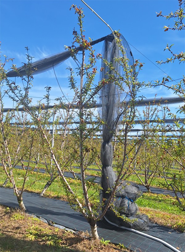 Dal punto di vista tecnico, le piante sono allevate secondo la forma a V, una struttura in cui gli alberi sono inclinati alternativamente di circa 60° lungo l’asse longitudinale, fissati su due fili portanti sostenuti da una palificazione dotata di braccetti trasversali. La densità di piantagione si attesta intorno a 2.000 alberi per ettaro, ma il numero effettivo di fusti produttivi è molto più alto: “Ogni pianta sviluppa due branche basali, formando una sorta di candelabro inclinato che, di fatto, triplica il numero dei fusti attivi”.