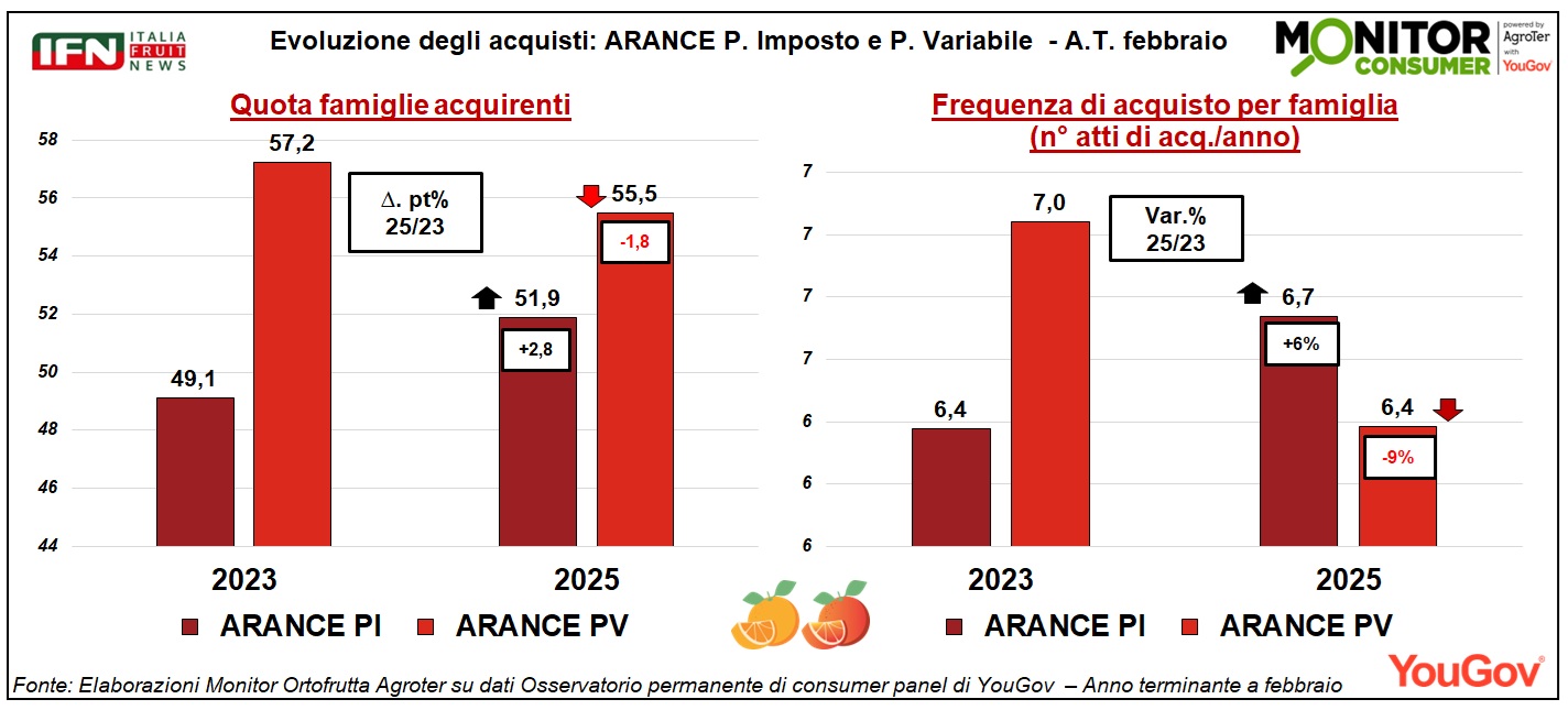 Questo scenario sfavorevole per la categoria delle arance merita un approfondimento in relazione alla modalità di vendita, poiché emergono tendenze nettamente divergenti. Le arance vendute a peso imposto — ovvero confezionate, e rappresentanti oltre la metà degli acquisti — registrano una crescita sia nella quota di famiglie acquirenti (+2,8 punti percentuali) sia nella frequenza di acquisto (+6%). Al contrario, le arance vendute a peso variabile, tipicamente sfuse, mostrano un andamento opposto: perdono infatti 1,8 punti nella quota di famiglie acquirenti e segnano un calo del 9% nella frequenza di acquisto.