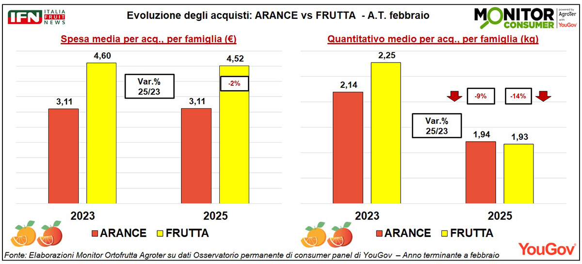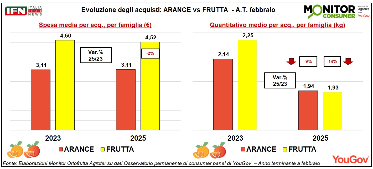 Per quanto riguarda la spesa media per acquisto, le arance mostrano una sostanziale stabilità, a differenza della frutta in generale che registra una lieve flessione del 2%. Anche l’analisi dei quantitativi medi acquistati premia la categoria delle arance, che segnano un calo più contenuto rispetto al totale frutta: -9% contro -14%.