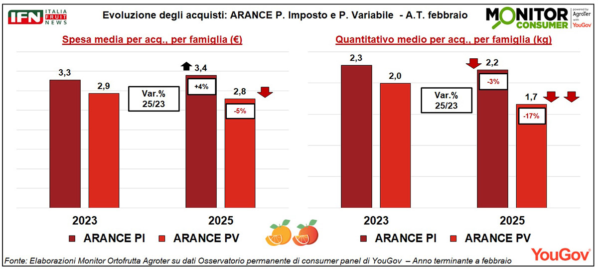 Anche in questo caso, le arance vendute a peso imposto mostrano performance migliori rispetto a quelle a peso variabile. Per le prime, ovvero le confezionate, la spesa media per acquisto è in crescita (+4%), mentre si registra un calo per le arance sfuse (-5%). Il quantitativo medio per acquisto diminuisce in entrambe le modalità, ma con un’intensità decisamente più contenuta per il peso imposto (-3%) rispetto al peso variabile, che segna un calo marcato del 17%.