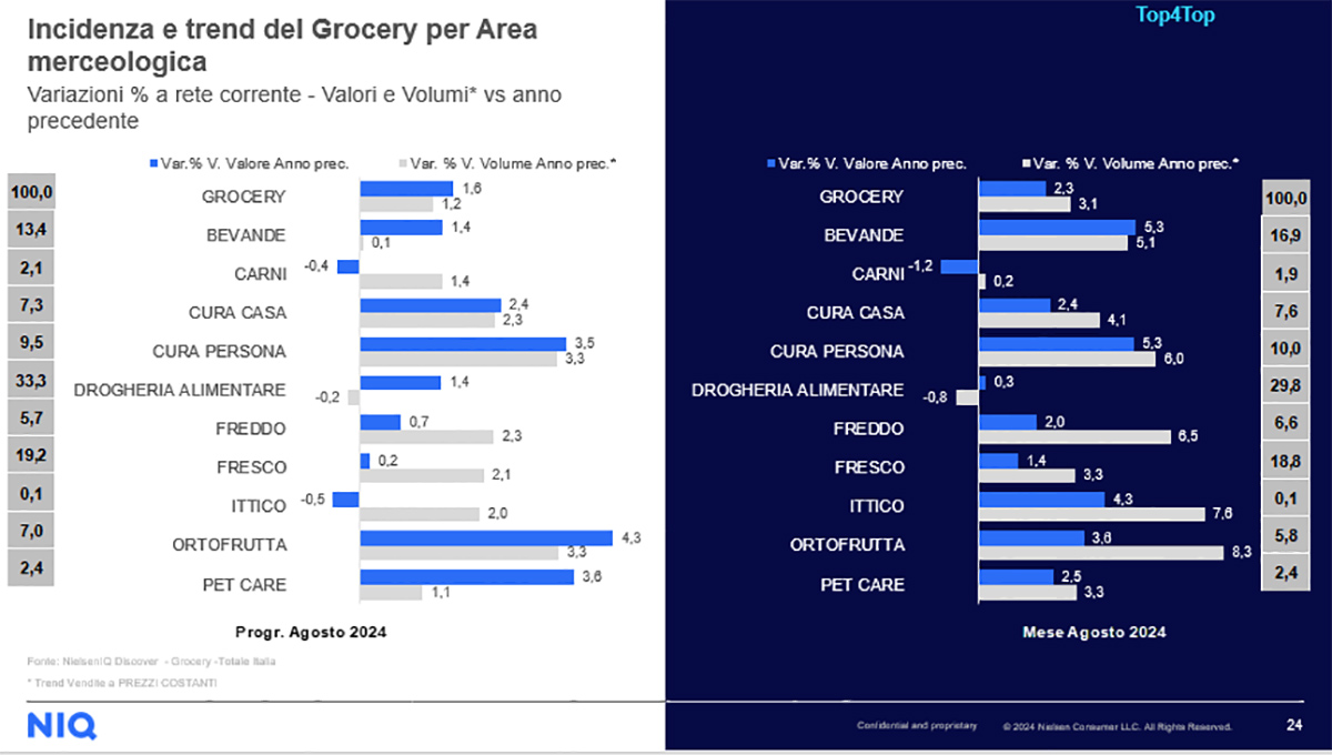 Ad agosto 2024, tra le aree merceologiche che hanno registrato un importante incremento rispetto all’anno precedente, si evidenziano i prodotti Bevande e Cura della persona, entrambi con un aumento a valore del +5,3% e una crescita a volume rispettivamente del +5,1% e del +6%, seguiti dall’Ittico, con un valore del +4,3% e una quota a volume del +7,6%. In generale, tutte le categorie hanno visto una crescita sia per le variazioni a valore sia per quelle a volume. In controtendenza invece le Carni, che registrano un calo del -1,2% a valore e un lieve aumento del +0,2% a volume.