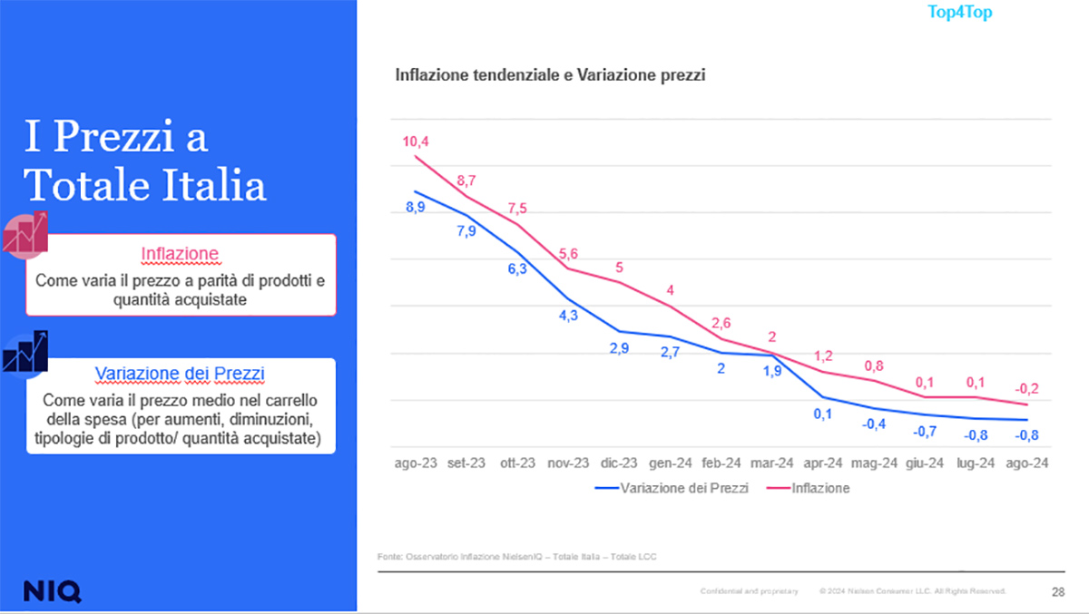 Ad agosto 2024, l'indice di inflazione nel Largo Consumo Confezionato (Lcc) si attesta al -0,2% a Totale Italia Omnichannel (vs agosto 2023) e grazie alla variazione del mix del carrello della spesa, messa in atto dai consumatori, la variazione reale dei prezzi è pari al -0,8%.