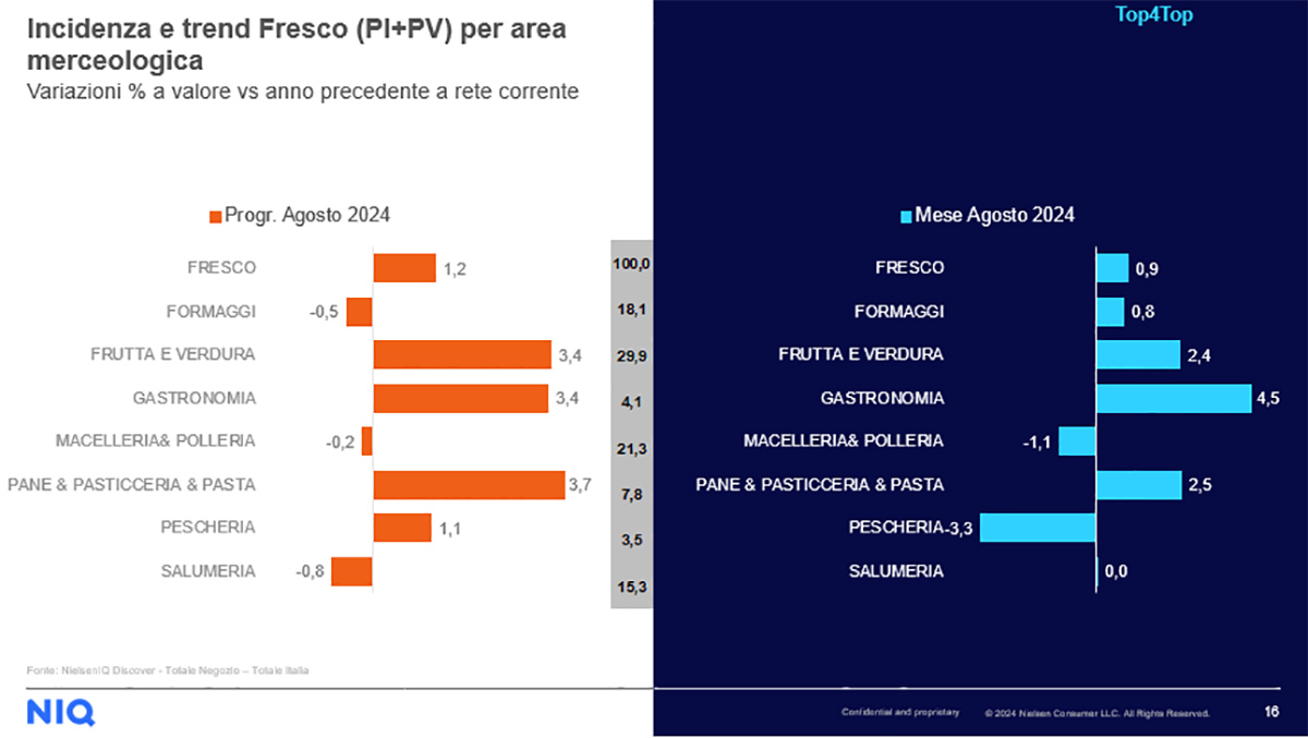 La fascia del Fresco (Peso Fisso + Peso Variabile) cresce nei Supermercati a +2,7% e nei Discount a +1% ma cala in tutti gli altri canali distributivi, con un picco per gli Iper>4500 a -3,2%. Tra le tre categorie merceologiche più dinamiche per valore all’interno del comparto si trovano Gastronomia, al +4,5%, e Pane & Pasticceria & Pasta, con il +2,5%, seguite subito dopo da Frutta e Verdura (+2,4%). Pescheria e Macelleria & Polleria si attestano invece come le categorie con i trend più bassi, rispettivamente al -3,3% e al -1,1%. (gc)