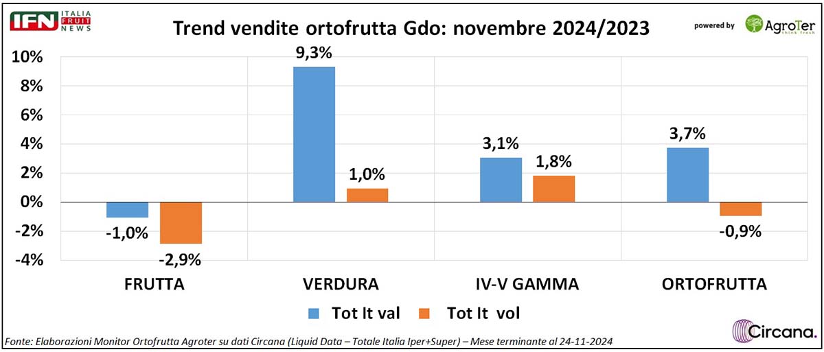 Novembre è tradizionalmente considerato un mese "morto" per le vendite di ortofrutta e i dati del reparto in ipermercati e supermercati lo confermano: -0,9% a volume. A trainare il calo è la frutta, che registra una flessione significativa (-2,9%), mentre la verdura (+1%) e, soprattutto, la IV-V Gamma (+1,8%) mostrano una crescita, seppur insufficiente a risollevare l'intero comparto.