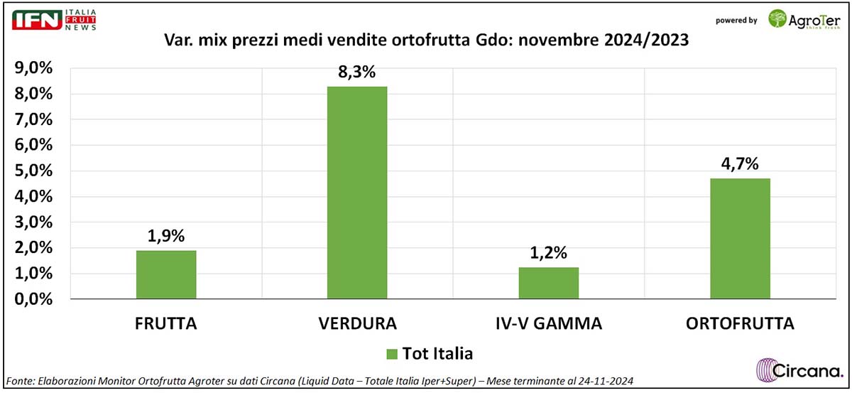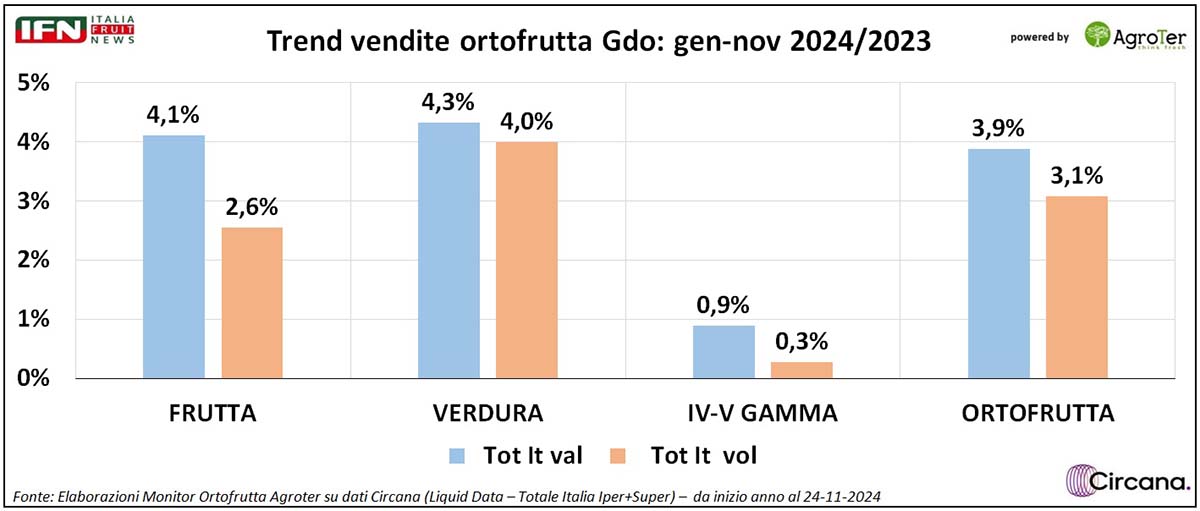 Come accennato, i dati del progressivo da gennaio annunciano un fine anno positivo: +3,1% a volume con un prezzo medio mix in lieve crescita. Qui si nota la buona performance della prima gamma (verdura +4% e frutta +2,6%), mentre per la IV-V Gamma (+0,3%) sarebbe un risultato positivo mantenere il pareggio rispetto al 2023, dopo l'avvio preoccupante di inizio anno.