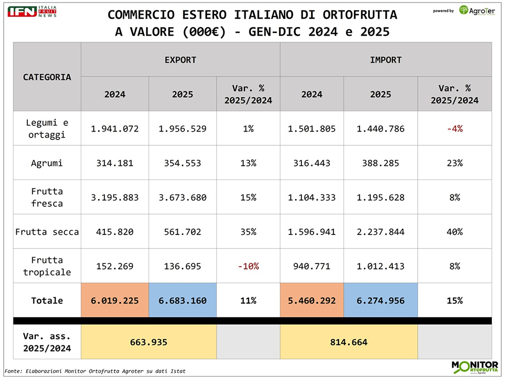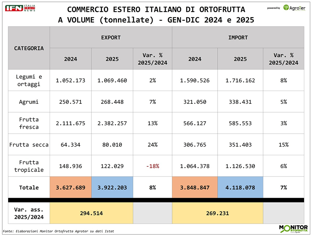 Le esportazioni italiane di ortofrutta crescono, ma non abbastanza da tenere il passo dell’import. Il risultato? Una bilancia commerciale che resta negativa a volume, pur registrando il primato dall’export, in aumento a doppia cifra fino a 6,7 miliardi di euro. È questa, in sintesi, la fotografia che emerge dalle elaborazioni del Monitor Ortofrutta Agroter su dati Istat relativi al consuntivo dell'intero 2025.