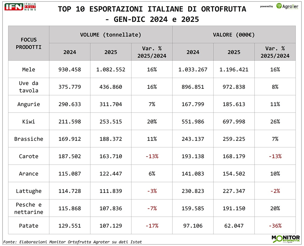 Nel totale 2025, le esportazioni ortofrutticole italiane raggiungono le 3,9 milioni di tonnellate, con un incremento dell’8% rispetto all’anno precedente. Ancora più marcata è la crescita a valore, che segna un +11% e porta il totale a 6,7 miliardi di euro.