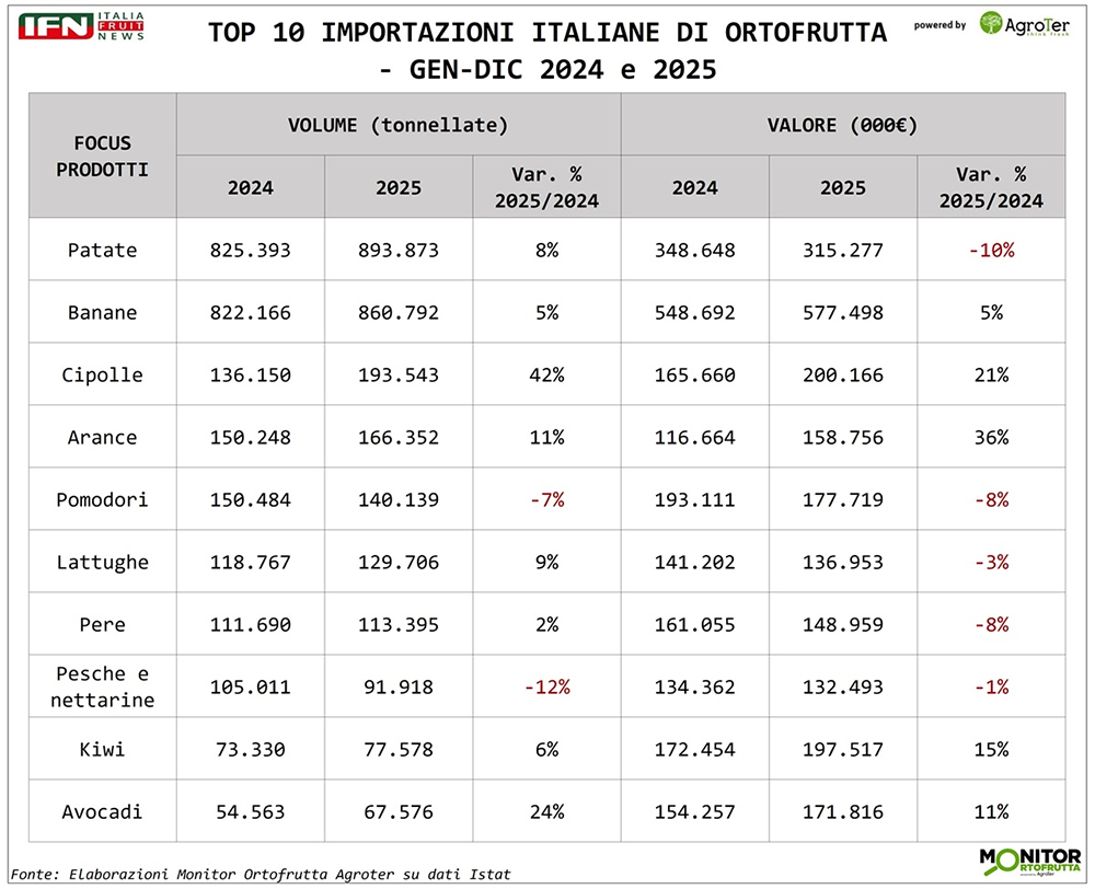 Nella graduatoria dell’import del 2025, spiccano le patate che rappresentano il prodotto più acquistato all’estero, con quantitativi che si avvicinano alle 900 mila tonnellate (+8%). A fronte dell’aumento dei volumi, però, il valore cala del 10%, segnalando una sensibile riduzione delle quotazioni. Le banane occupano la seconda posizione, con una crescita moderata sia nei volumi sia nel valore, entrambi pari al +5%. Al terzo posto si collocano le cipolle, che registrano l’aumento più marcato nei quantitativi importati (+42%), mentre la spesa cresce in misura più contenuta (+21%). Da segnalare, infine, anche la progressiva crescita dell’avocado sulle tavole degli italiani: pur occupando l’ultima posizione della classifica, fa segnare quasi un +25% nei volumi importati, a fronte di un incremento della spesa limitato all’11%, grazie a prezzi relativamente più contenuti.