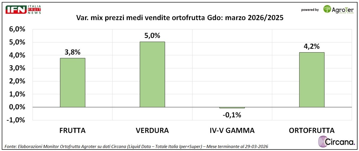 Su questa dinamica pesa l’aumento del prezzo medio mix (+4,2% per il reparto), marcato sia nella frutta (+3,8%) sia nella verdura (+5%), mentre resta invariato nella IV-V gamma. Proprio questa variabile contribuisce a sostenere le vendite a valore, portando il risultato economico complessivo del reparto in territorio positivo (+2,7%).