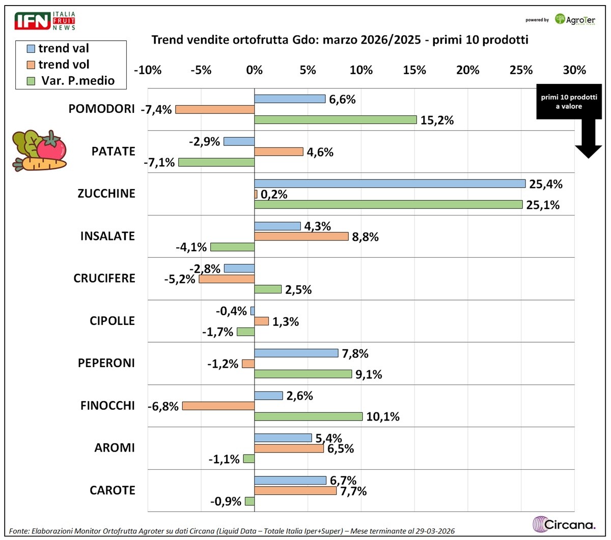 Le analisi del Monitor Ortofrutta di Agroter, realizzate in collaborazione con Circana, delineano un quadro a due velocità per le vendite di ortofrutta nella Gdo: rallentano i volumi della prima gamma, penalizzati da minore disponibilità di prodotto e prezzi in aumento, mentre i prodotti servizio mostrano una crescita solida e prezzi stabili. Il risultato è un mercato più selettivo, in cui le difficoltà produttive incidono sui consumi, ma non impediscono al valore complessivo di restare positivo.