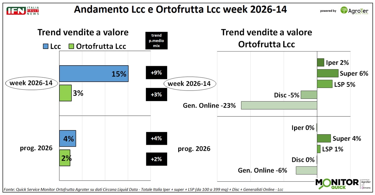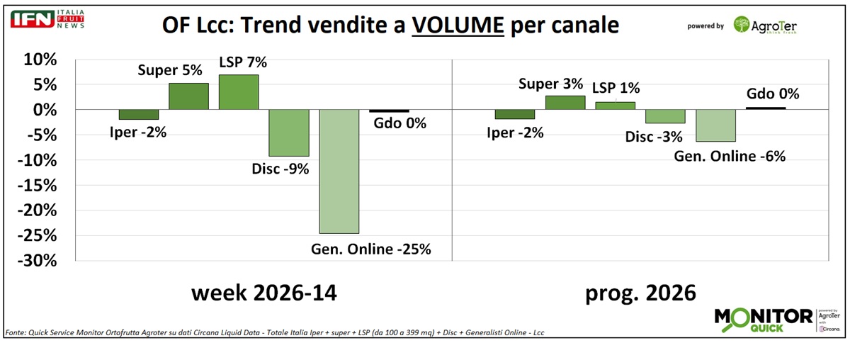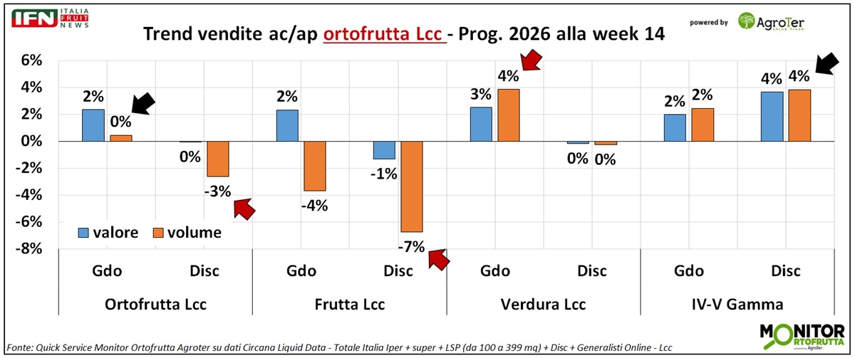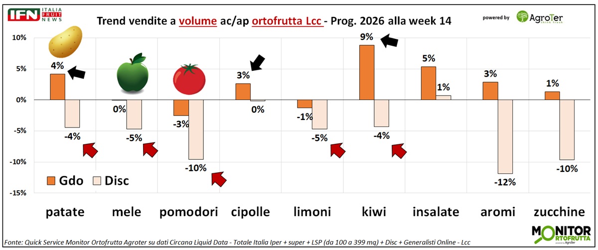 Anche nella settimana 14 l’ortofrutta Lcc registra un andamento negativo. Le vendite a valore crescono grazie all’aumento del prezzo medio mix, mentre i volumi restano stagnanti. Su questo quadro pesa in modo significativo la performance del discount, che dall’inizio dell’anno si conferma il canale fisico più debole. In particolare, alcune categorie mostrano nel discount risultati nettamente peggiori rispetto all’andamento complessivo della Gdo: tra queste, patate, mele e pomodori a peso imposto spiccano sia per rilevanza nei volumi sia per il delta di performance rispetto alla Gdo nel complesso.