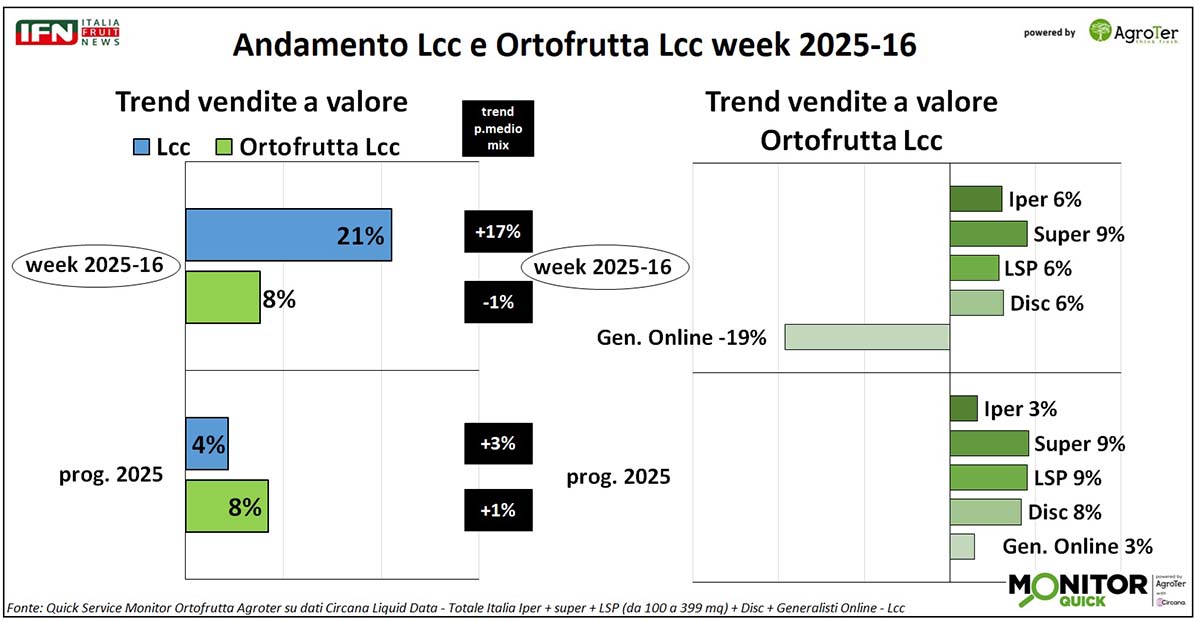 Con la week 16, che si chiude con la Pasqua, ci si avvicina alla fine del mese di aprile, e le vendite a valore mostrano un’ottima tenuta rispetto alle settimane precedenti: +21% per l’Lcc e +8% per l’ortofrutta a peso imposto, anche grazie all’effetto positivo della ricorrenza. Per l’Lcc, tuttavia, il prezzo medio mix segna un aumento marcato, vicino alla doppia cifra (+17%), mentre per l’ortofrutta Lcc si registra una lieve flessione (-1%).