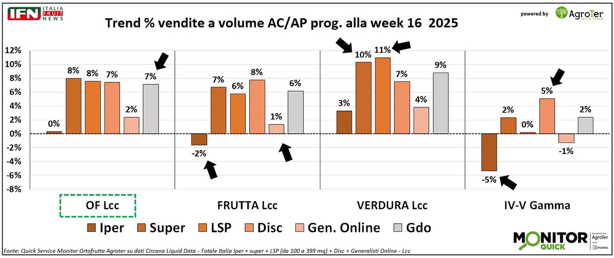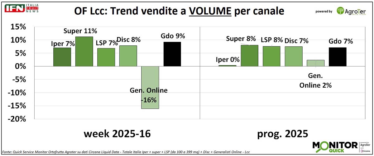 Nell’analisi dei trend a volume da inizio anno per macrocategoria nei diversi canali, la frutta risulta trainata dai supermercati (+7%), dal libero servizio (+6%) e dal discount (+8%). L’ipermercato mostra una lieve flessione (-2%), mentre l’online registra una crescita contenuta (+1%).