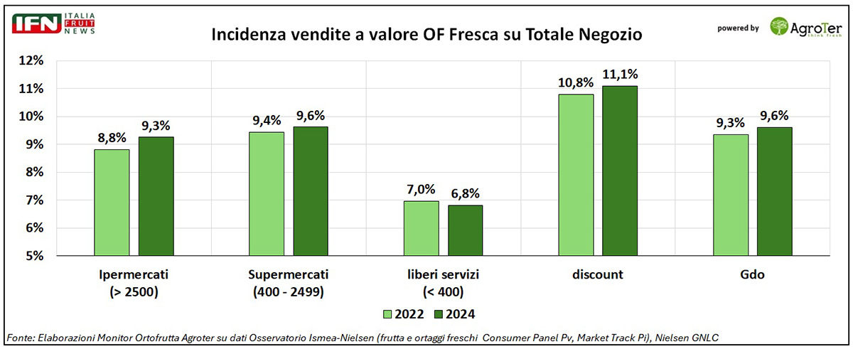 Il peso strategico dell’ortofrutta emerge con ancora maggiore evidenza se si confrontano le quote di vendita per canale riferite a questo reparto con quelle relative al fatturato complessivo dei negozi. Nel 2024, i discount detengono una quota del 27,4% nelle vendite di ortofrutta, a fronte di una quota del 23,8% sul totale del fatturato: un divario positivo di 3,7 punti percentuali. Negli altri format, invece, questa differenza è contenuta e, ad eccezione dei supermercati, non è favorevole all’ortofrutta.