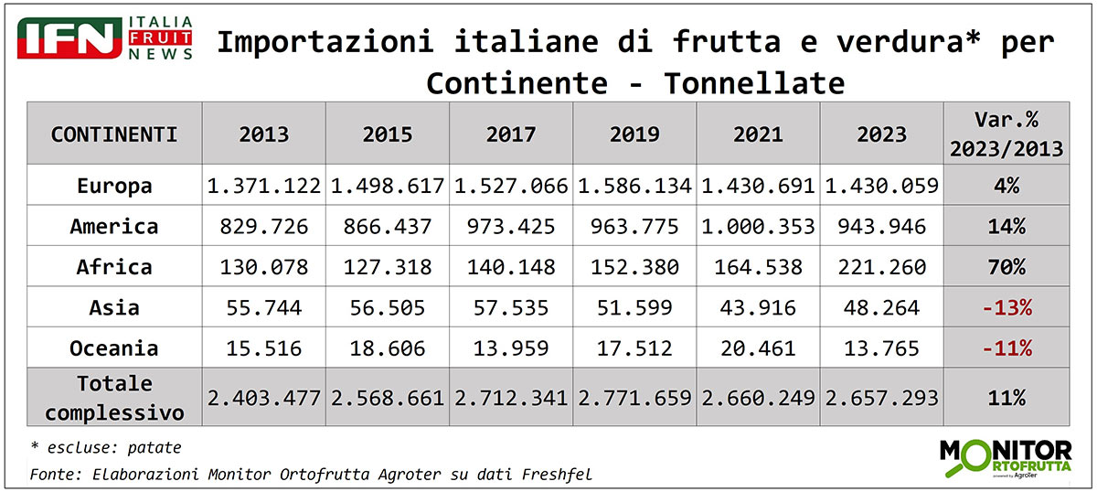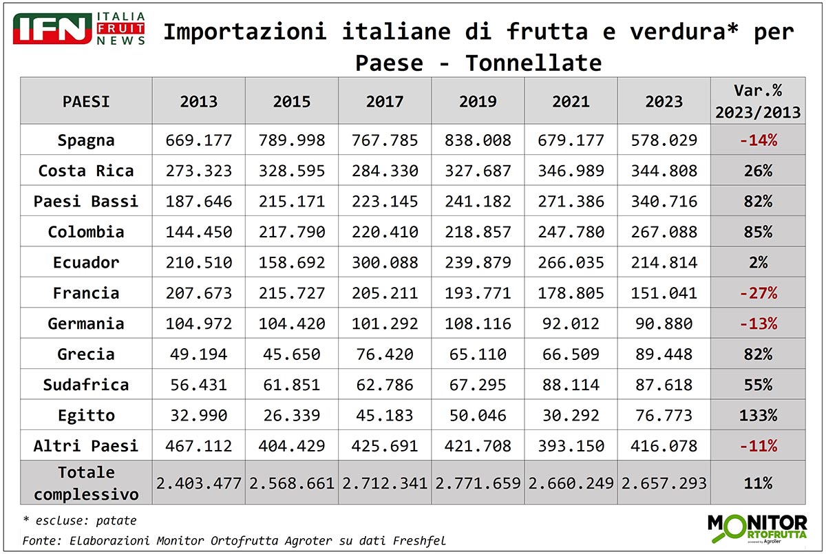 A seguire troviamo Costa Rica e Paesi Bassi, entrambi con volumi superiori alle 300 mila tonnellate e in forte crescita rispetto a dieci anni fa. Il boom dell’esotico si fa sentire: i Paesi Bassi, infatti, sono tra i principali riesportatori di avocado, mentre anche la Colombia (+85%) e, in misura minore, l’Ecuador (+2%), vedono aumentare le proprie spedizioni verso l’Italia, e sappiamo bene l’importanza di queste nazioni nel comparto banane, a partire dall’Ecuador.