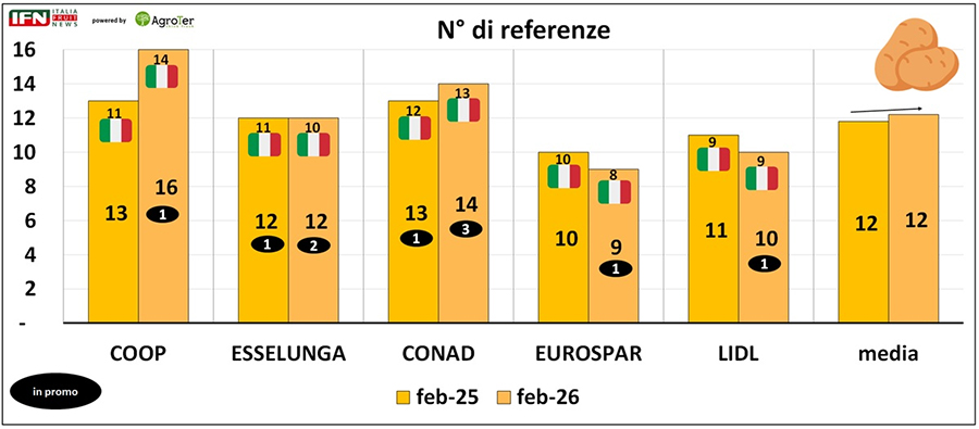 Il numero medio di referenze di patate presenti a banco non registra variazioni significative tra il 2025 e il 2026, attestandosi complessivamente intorno alle 12 unità. A distinguersi è soprattutto Coop, che passa da 13 a 16 referenze, mentre nelle altre insegne gli scostamenti sono minimi: Conad cresce di una proposta, Eurospar e Lidl ne perdono una, ed Esselunga resta stabile con 12 referenze.