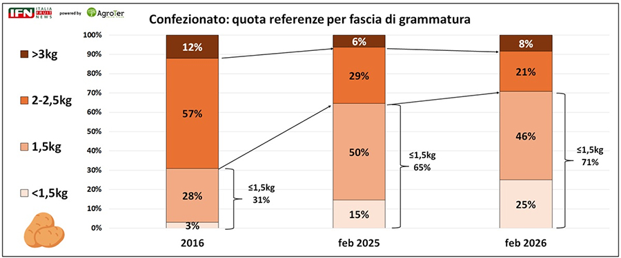 In continuità con l’analisi avviata nel 2025, è stata confrontata la quota di referenze confezionate per fascia di grammatura con quella rilevata in un campione di punti vendita dieci anni fa, nel 2016. Il confronto evidenzia con chiarezza lo spostamento della Gdo verso le piccole grammature: le confezioni da 1,5 kg o inferiori passano infatti dal 31% del 2016 al 65% del 2025, fino a raggiungere il 71% nel 2026. Parallelamente diminuisce il peso delle confezioni da 2 kg in su, che oggi rappresentano la quota minoritaria degli assortimenti.