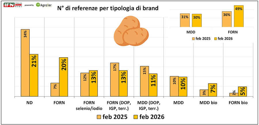 Sul fronte delle origini prevale nettamente il prodotto nazionale, che rappresenta circa il 90% dell’assortimento in entrambi gli anni, con una quota residuale di referenze estere, in particolare egiziane, legate soprattutto alla tipologia delle patate americane.