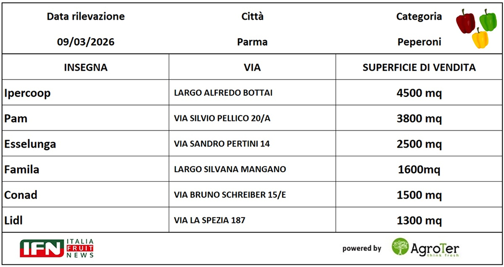 La categoria “peperoni e peperoncini” è già stata analizzata da Italiafruit News attraverso rilevazioni effettuate su un campione di sei punti vendita di Parma in due momenti distinti: a marzo e a ottobre 2025 a cui si aggiunge oggi una nuova rilevazione. L’analisi evidenzia strategie differenziate tra le insegne: alcune mantengono assortimenti essenziali, altre un’offerta ampia e profonda, accompagnandola con un aumento dello spazio espositivo che, tuttavia, resta ancora leggermente sottodimensionato rispetto ad altre categorie orticole.