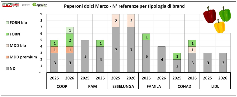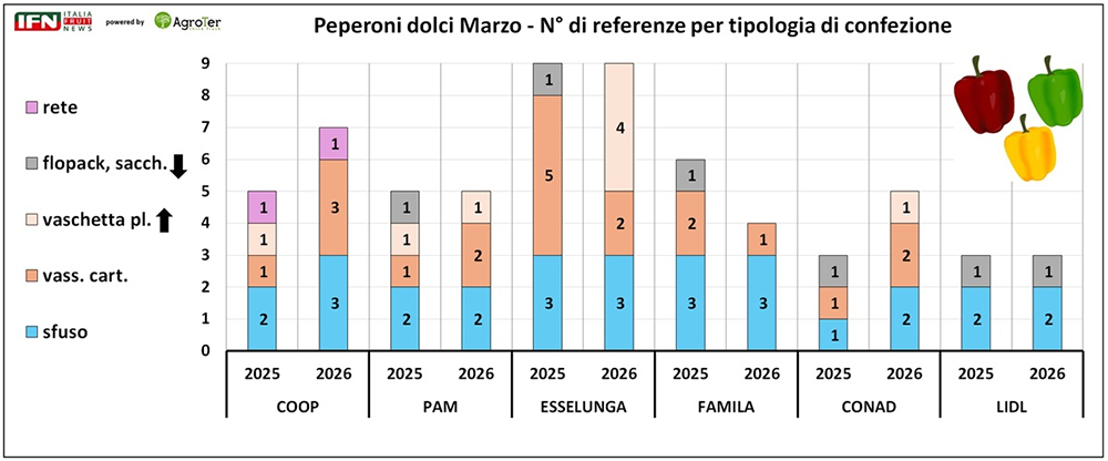 Più articolata e segmentata è invece l’offerta di peperoni dolci, che nei sei negozi analizzati evidenzia una certa variabilità in termini di ampiezza assortimentale. Nel 2026 Esselunga è l’insegna con la gamma più ampia, pari a 9 referenze, sostanzialmente in linea con il 2025. Segue Coop che, pur disponendo di maggior spazio espositivo potenziale, si attesta a 7 proposte nel 2026: un dato in crescita rispetto a marzo 2025 (5 referenze), ma in calo rispetto a ottobre dello stesso anno (9). Gli altri supermercati presentano assortimenti compresi tra 4 e 5 referenze, con una certa variabilità nelle tre rilevazioni, mentre Lidl si ferma a 3, confermando un’offerta più essenziale in linea col format discount.