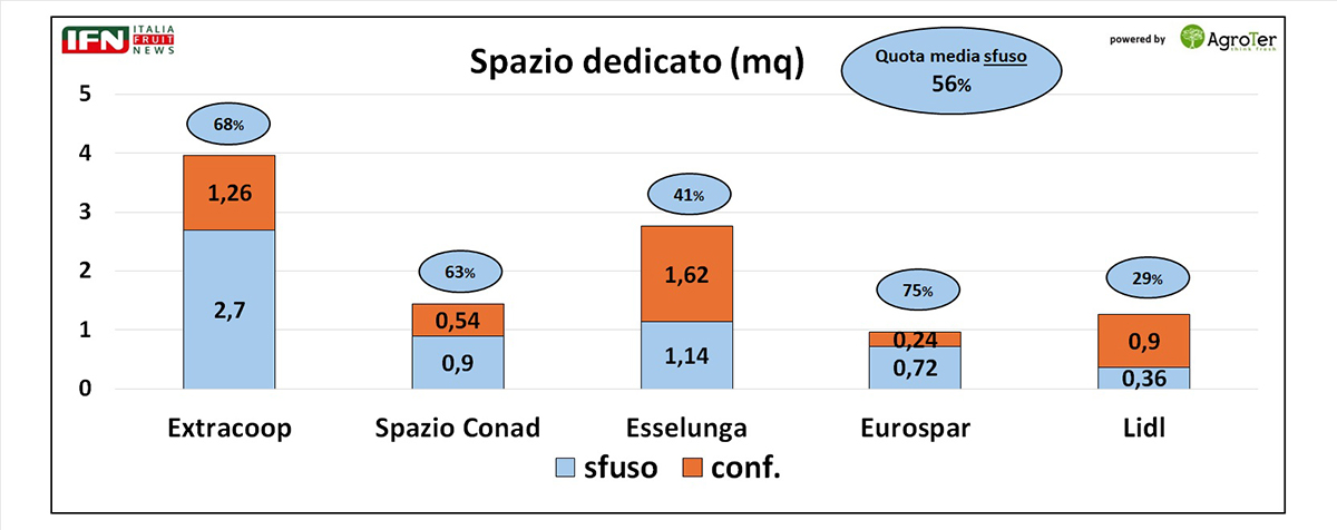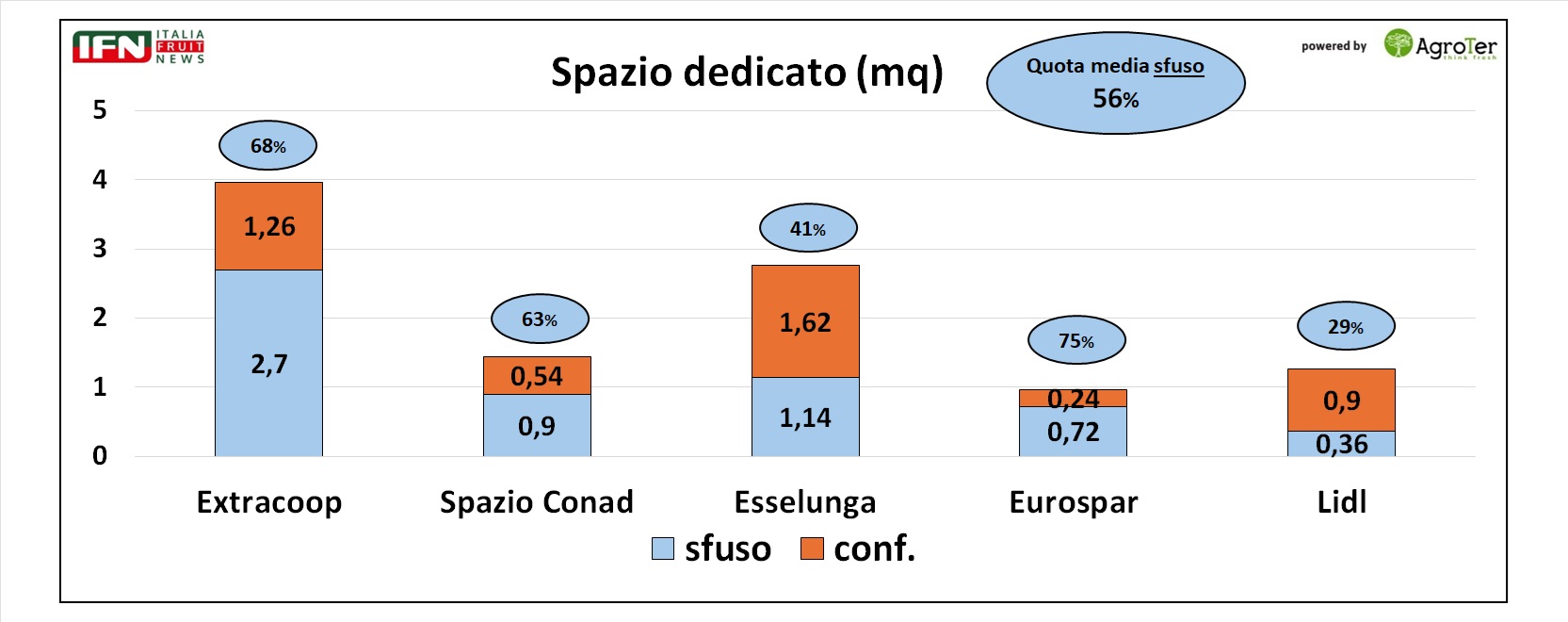 Per quanto riguarda lo spazio espositivo, in Conad, Eurospar e Lidl è distribuito in modo proporzionale alle referenze: la quota di spazio destinata allo sfuso rispecchia quella delle referenze. In Coop ed Esselunga, invece, lo sfuso è sovraesposto, con una quota di spazio superiore rispetto al numero di referenze, anche se la differenza non è troppo marcata.