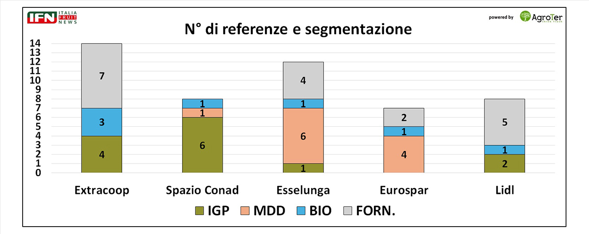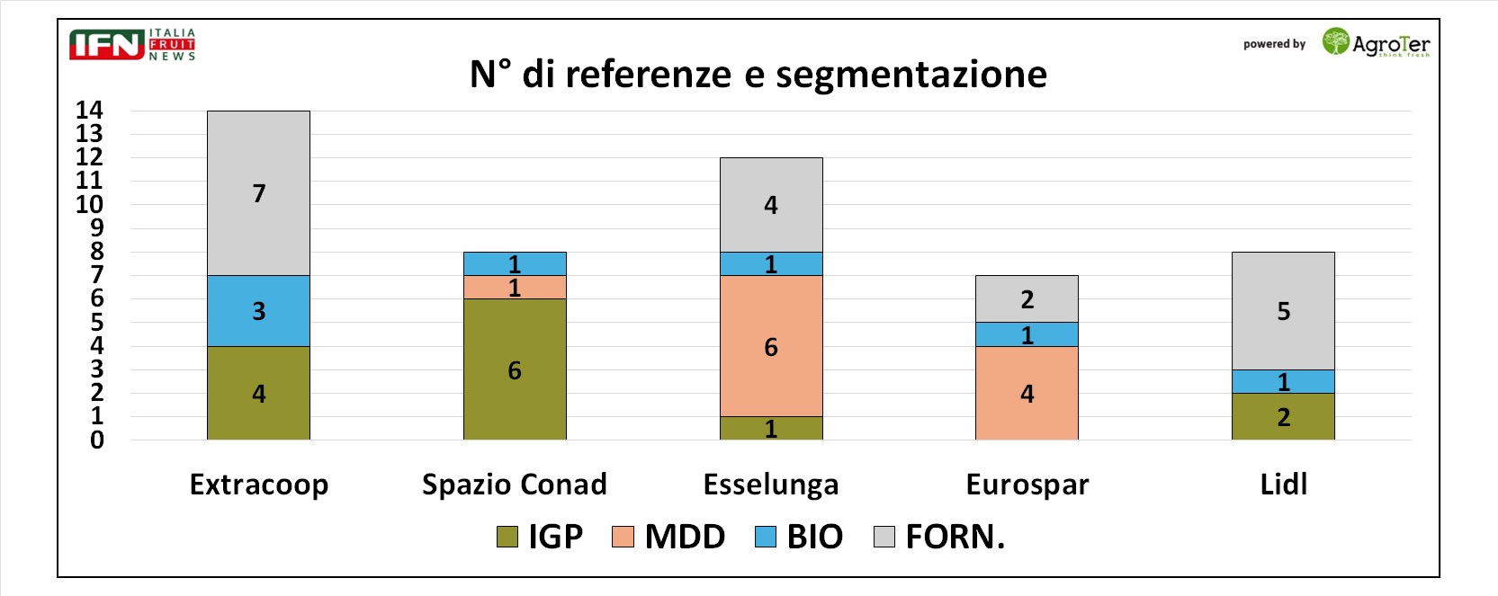 La prima è la provenienza (per il 94% delle referenze l'origine è italiana), che trova la sua massima espressione nella Pera dell'Emilia-Romagna IGP. Almeno una referenza IGP è presente in quasi tutti i negozi, con un’unica eccezione. Coop e Conad si distinguono per la profondità, offrendo rispettivamente 5 e 6 referenze, quasi tutte esclusivamente in co-branding con l’insegna. In particolare, in Conad, sia le IGP che la referenza locale fanno parte della linea “I nostri ori”, a cui l’insegna attribuisce grande importanza, evidenziandola attraverso assortimenti ampi, spazi dedicati e un’enfasi particolare nella vendita.