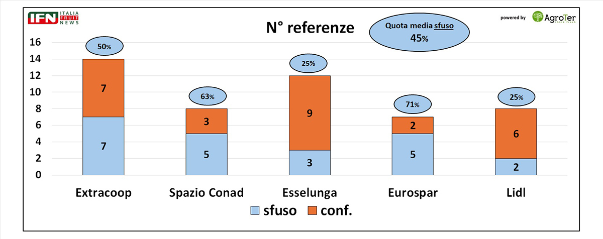Nel totale delle referenze rilevate, la modalità di vendita prevalente è quella confezionata, che rappresenta il 55% del totale. Le confezioni sono principalmente vassoi in cartone o plastica e cestini. Lo sfuso copre invece il 45% delle referenze, con variazioni significative in Esselunga e Lidl, dove lo sfuso si ferma al 25%.