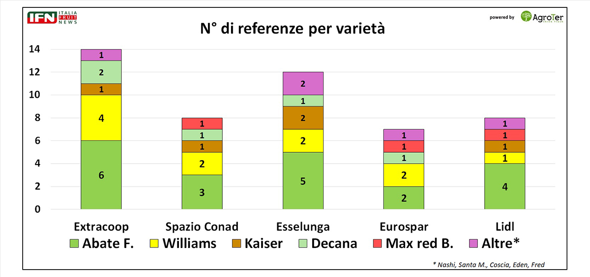 Passando alla distribuzione delle referenze per singola varietà, la regina indiscussa è la Abate Fetel, presente in tutti i negozi con almeno una doppia referenza e un massimo di sei. Segue la Williams, anch’essa sempre presente, ma con una gamma più contenuta: da un minimo di una referenza a un massimo di quattro.