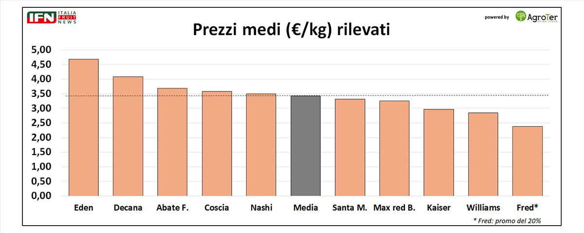 La media complessiva è poco inferiore ai 3,5 euro al chilo, con la Decana che svetta a oltre 4 euro al chilo, e una delle novità tra gli assortimenti (Eden), che risulta essere la più cara, con un prezzo superiore ai 4,60 euro al chilo, mentre la Fred si posiziona come prezzo più basso (sotto i 2,50 euro il chilo), anche se su tale referenza era applicato uno sconto del 20%.