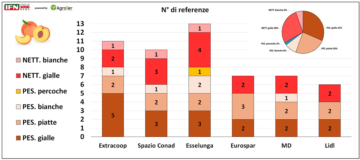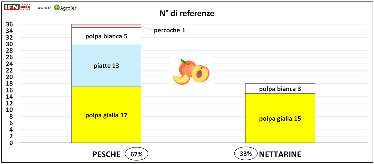 Inoltre, la maggiore presenza di referenze di pesche, a polpa bianca (5) o gialla (17), rispetto alle nettarine (3 a polpa bianca e 15 a polpa gialla) è dovuta anche a una maggiore profondità assortimentale, che include diverse tipologie: tra queste spiccano le pesche piatte, presenti con ben 16 referenze, e, in misura più marginale, le percoche, rappresentate da una sola referenza.