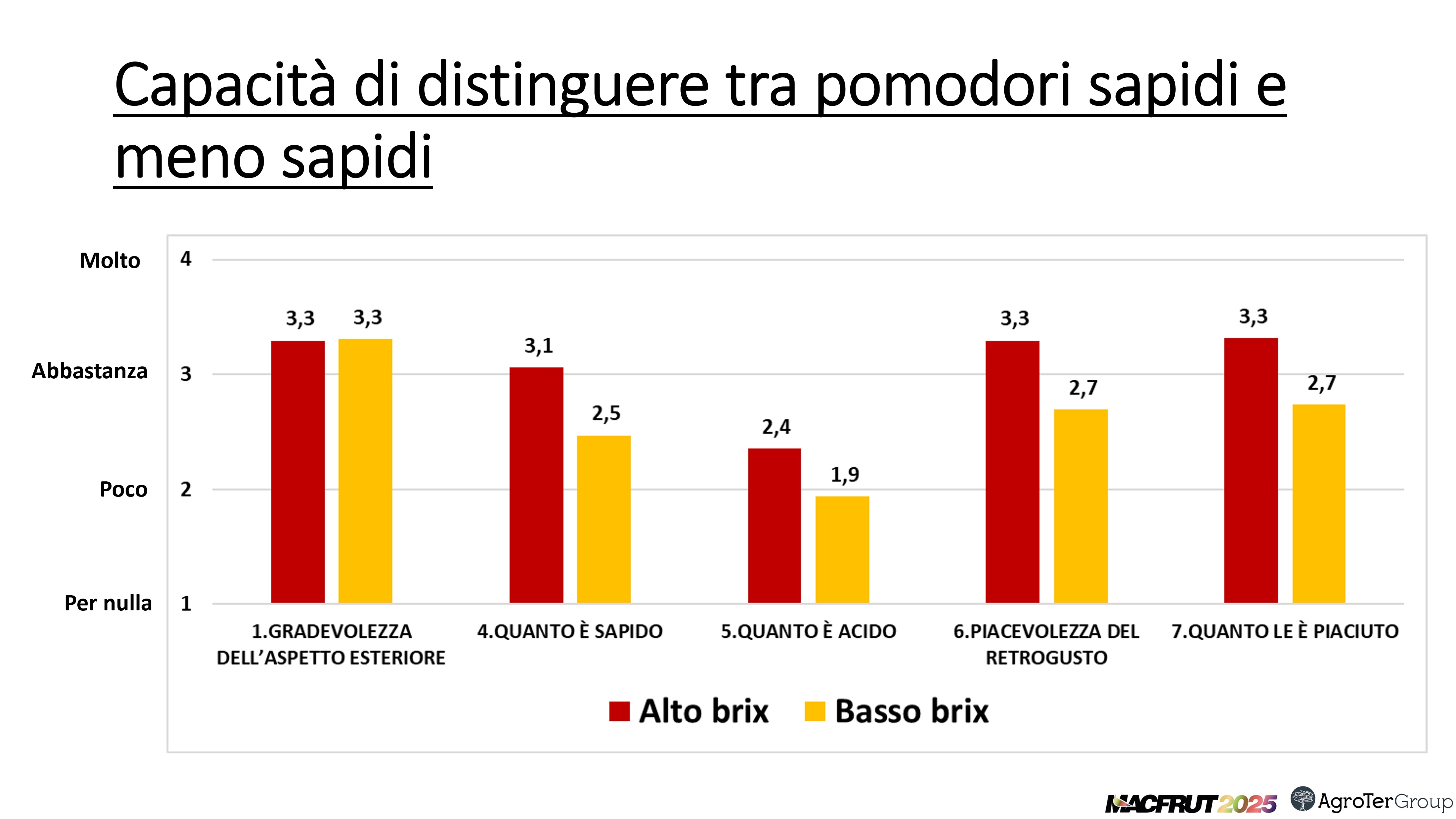 I risultati principali hanno confermato l’estrema complessità della categoria nelle preferenze e nelle ricettazioni preferite del consumatore. È emersa, in primis, la non completa correlazione tra sapidità (o sapore) del pomodoro e il gradimento complessivo, poiché nel giudizio e nella scelta finale del consumatore concorrono tanti altri fattori: il grado di acidità e il retrogusto, ma anche la piacevolezza al morso e alla masticazione, senza dimenticare come anche l’occhio voglia la sua parte, con preferenze accordate a pomodori con colori sgargianti o insoliti, anche se con voti sul gusto non particolarmente alti.