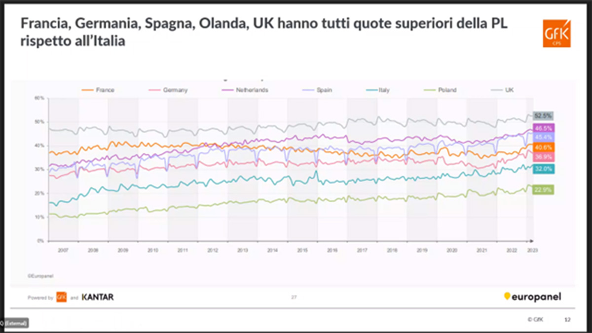 All’interno dell’Europa, l’Italia non primeggia di certo: rispetto al dato medio, si posiziona sotto di quasi dieci punti (32%), quando i nostri cugini spagnoli – invece – superano di oltre 4 punti la quota media della PL (45,4%). Lo scettro, però, va al Regno Unito che svetta con un 52,5% di quota per le vendite fatte attraverso la PL.