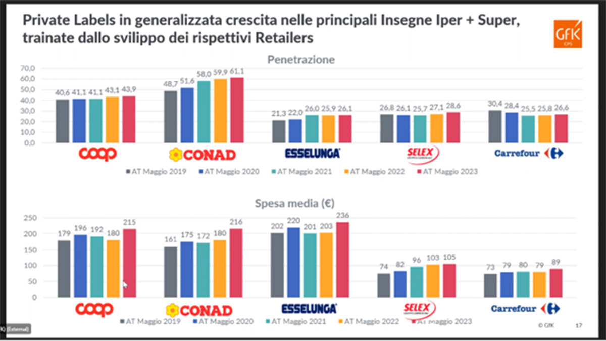 Concentrandoci sull’Italia, emerge come – a livello di Insegna – sia Conad ad avere la penetrazione della PL maggiore (61,1) e con una crescita importante dal 2019 (48,7 + 12 punti). Anche Coop ha certamente una quota interessante (43,9), anche se la crescita è contenuta.
