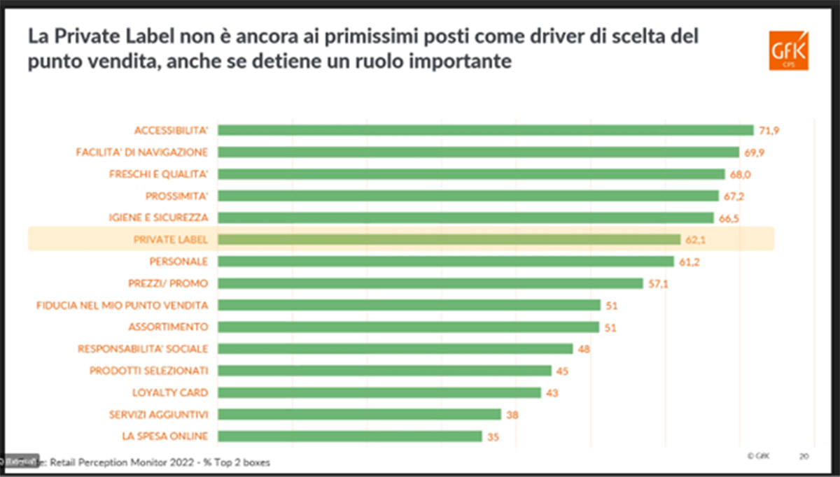È chiaro come la Private Label stia avanzando in Italia; tuttavia, a livello di driver nella scelta del negozio in cui fare la spesa, non è ancora tra quelli principali. Ad esempio, la PL è citata tra le prime due posizioni dal 62,1% del campione, quando per “freschi e qualità” siamo al 68% e compodit.