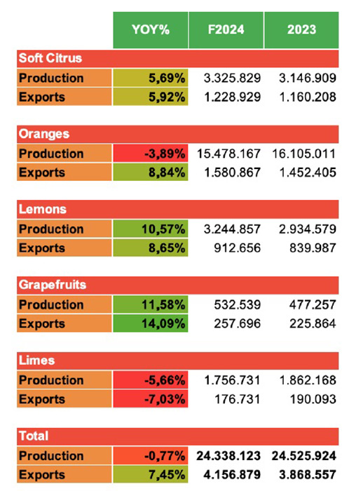 Per i limoni è previsto un aumento di produzione pari al 5,69% (3.244.857 tonnellate), mentre la produzione di pompelmi dovrebbe diminuire del 3,89% (pari a 532.539 tonnellate). I limes dovrebbero raggiungere 1.756.731 tonnellate, una quota in crescita del 10,57% rispetto ai volumi del 2023.