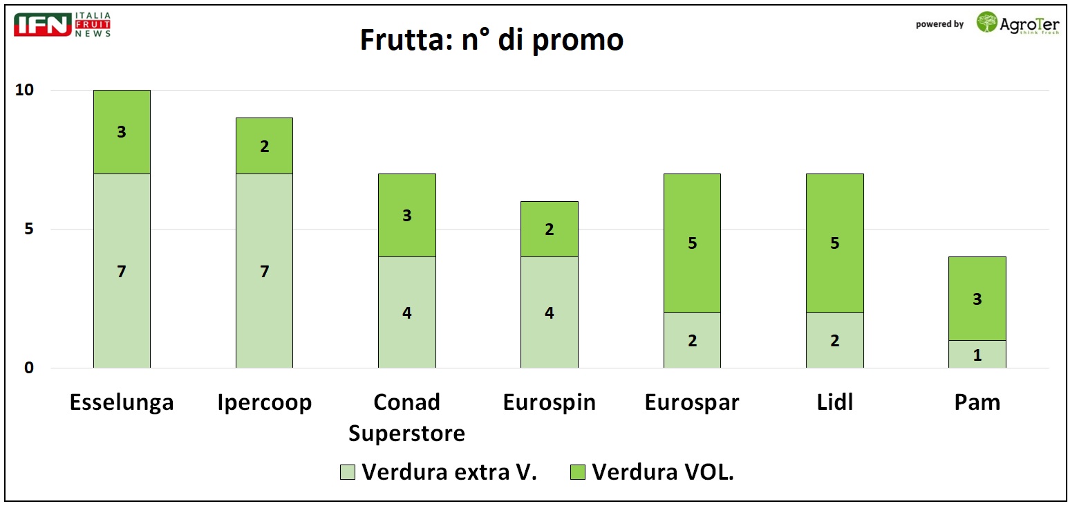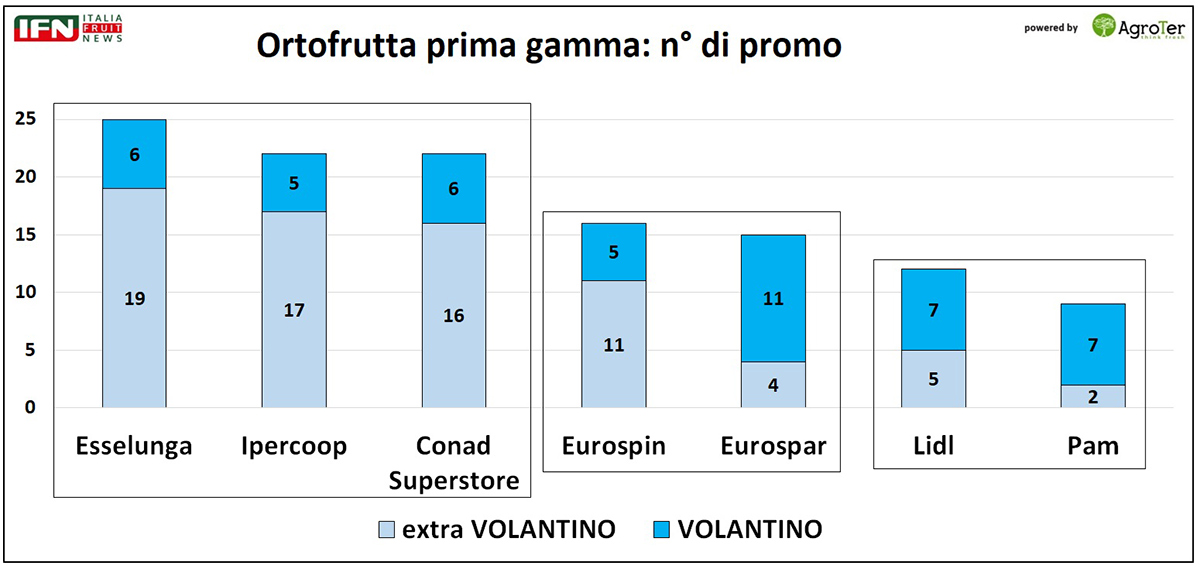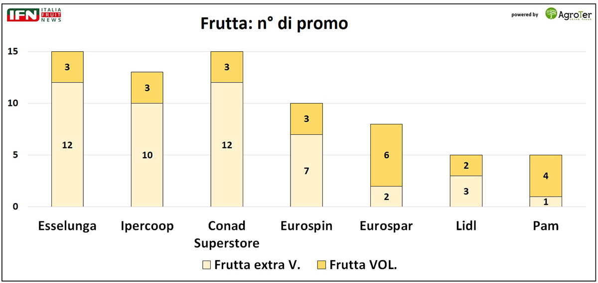 Senza dubbio, la maggiore variabilità legata alla produzione di frutta, spinge le insegne a privilegiare le promozioni interne, decisamente più flessibili nella gestione rispetto a quelle a volantino, che richiedono una programmazione più rigida e anticipata.