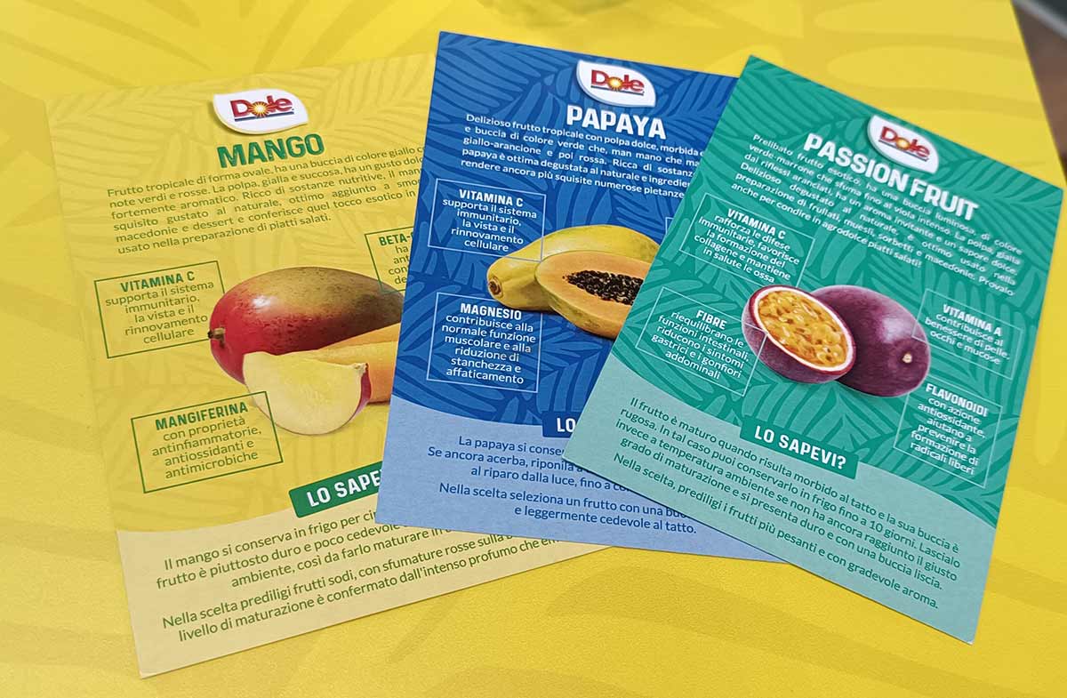 A livello si grafica, la linea si presenta omogenea e di forte impatto visivo: oltre al marchio Dole ben in evidenza sulle confezioni, l’uso di colori vivaci e distintivi per ciascun prodotto è finalizzato alla immediata riconoscibilità dello stesso sui banchi dell’ortofrutta. All’interno delle referenze in vassoio è presente anche un leaflet informativo: “La scelta di inserire il materiale nelle confezioni è stata fatta per permettere al consumatore di avvicinarsi al mondo della frutta esotica, non essendo parte della nostra cultura alimentare. Qui può leggere informazioni sul contenuto nutrizionale del prodotto e scoprire una sezione dedicata alle curiosità; sul retro può trovare una ricetta e alcune ‘tips’, con indicazioni, per esempio, su come scegliere il frutto, come tagliarlo o conservarlo”, precisa Bambini.