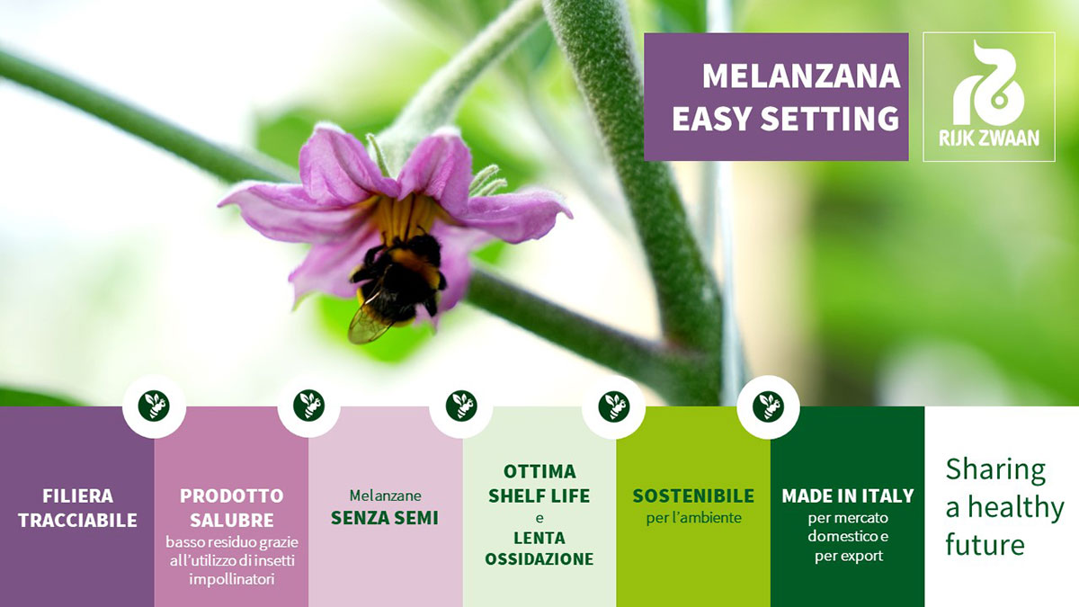 In questo scenario, Rijk Zwaan Italia, sussidiaria dell’omonima azienda olandese di breeding orticolo, lavora assieme a quei produttori che guardano al futuro e che hanno la lungimiranza di provare a cambiare le cose. Infatti, breeder e specialisti Rijk Zwaan sviluppano varietà di melanzana Easy Setting, che si adattano perfettamente a protocolli di gestione agronomica con l’utilizzo di insetti impollinatori, a beneficio della salubrità del prodotto finale e della sostenibilità ambientale, nonché di un contenimento dei costi di manodopera, particolarmente critici in questo momento.