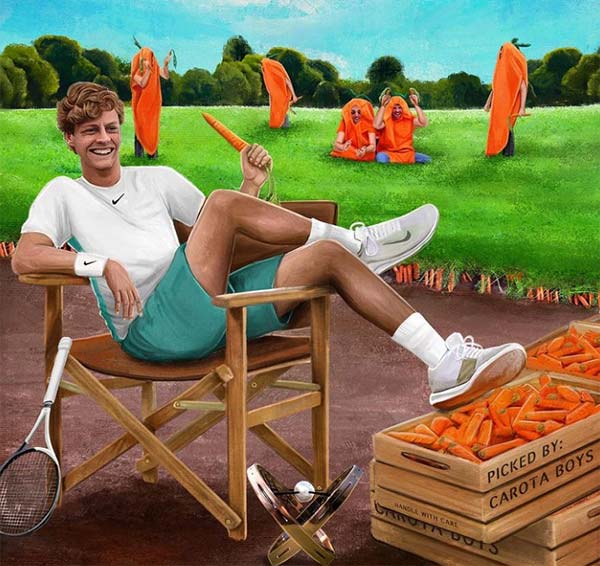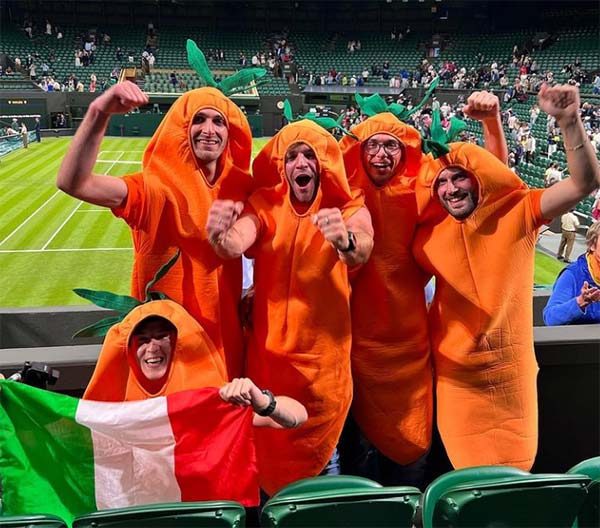 Ma perché proprio le carote? Tutto nasce, non dal colore di capelli del campione, come pensavano in tanti, ma dal torneo Atp di Vienna, del 2019. Sinner durante un cambio campo per ritrovare le energie, invece della consueta banana per recuperare forze e potassio, ricevette dal suo allenatore una carota. Da quel momento è scattata la scintilla e la decisione dei fans di travestirsi da carote.