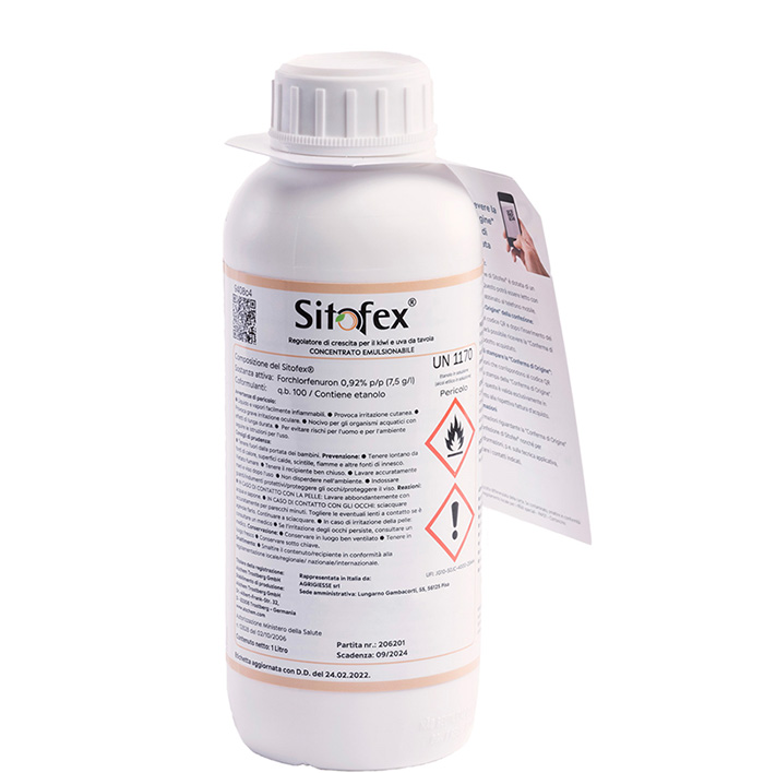 Grazie alla sua formulazione, Sitofex® assicura risultati stabili e performanti già alle dosi più basse previste in etichetta. Il suo utilizzo è ammesso su kiwi a polpa verde, gialla e rossa, nonché su uva da tavola, dove contribuisce a migliorare la pezzatura e la qualità dei frutti.