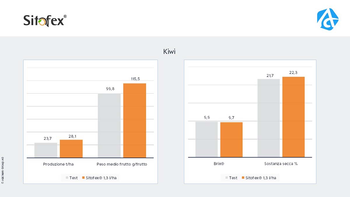 Una prova condotta nel 2023 in Piemonte su kiwi giallo ha evidenziato un chiaro aumento del peso medio del frutto e della resa a ettaro, mantenendo inalterati parametri chiave, come la forma e il grado Brix. Inoltre, sono migliorati sia il colore che il contenuto in sostanza secca, dimostrando come Sitofex® possa coniugare aumento produttivo e mantenimento della qualità, due aspetti oggi imprescindibili per le produzioni premium.